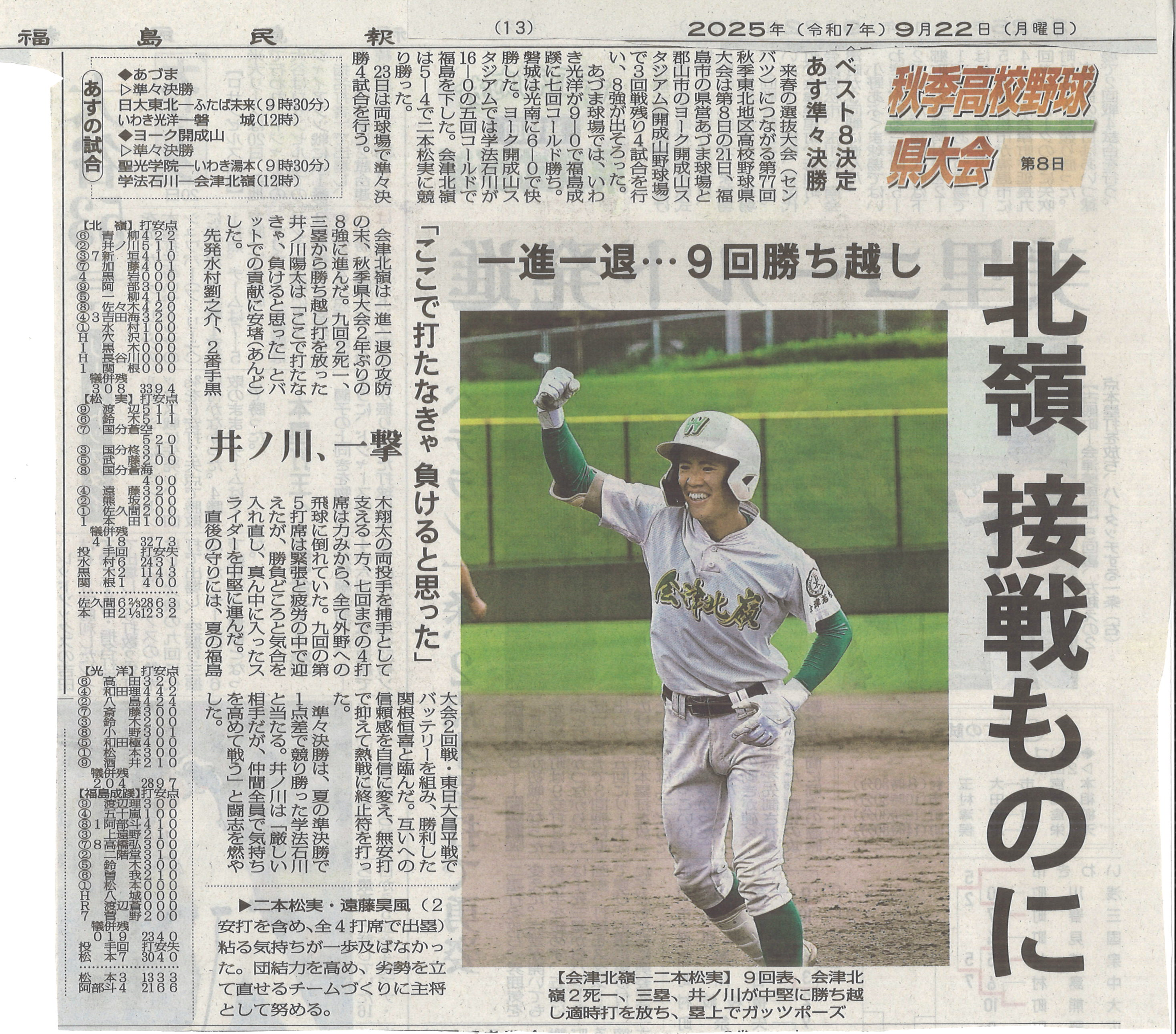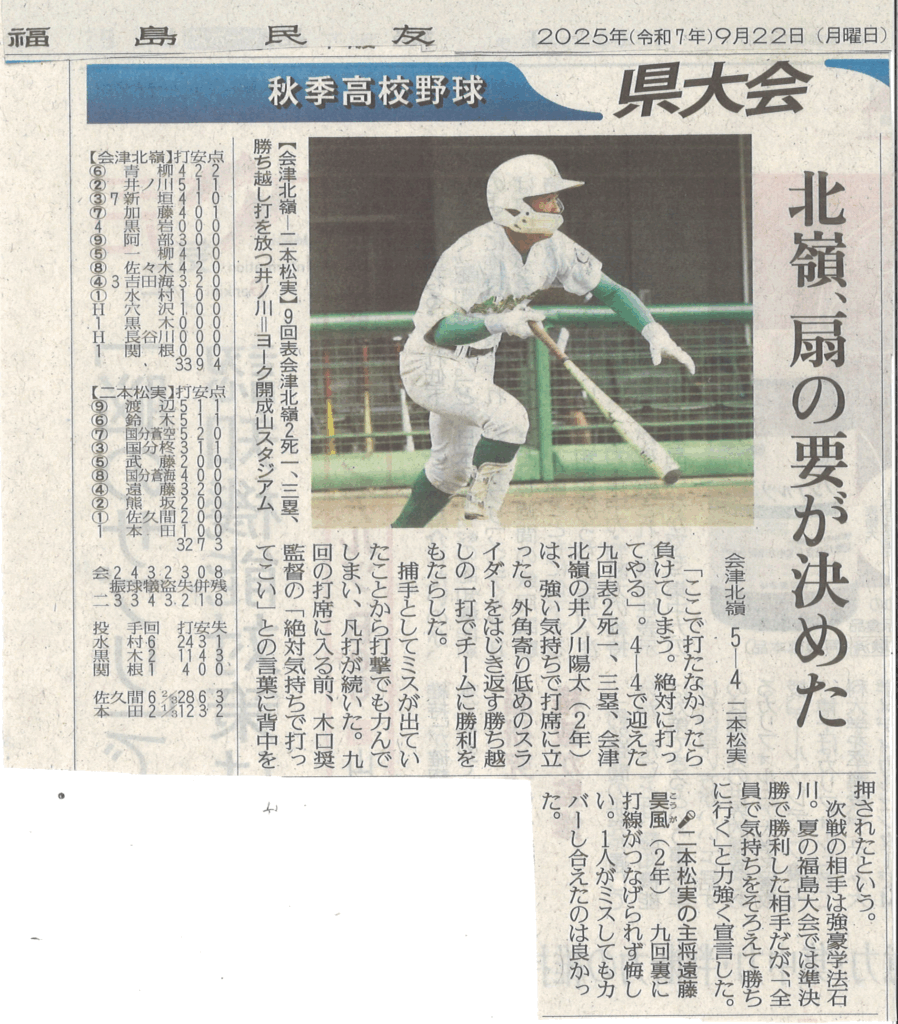 北嶺野球部 接戦ものに(福島民報・福島民友)
