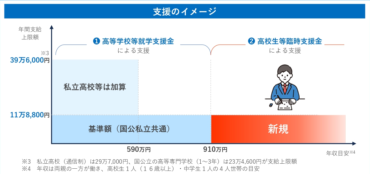 - 上記の図は文科省が想定している一般家庭(両親・高校生・中学生の4人家族で、両親の一方が働いている場合)において、年収目安として590万円以下の家庭は私立高校も授業料が無償化になり、それ以外は年額11万8,800円が支給されます。